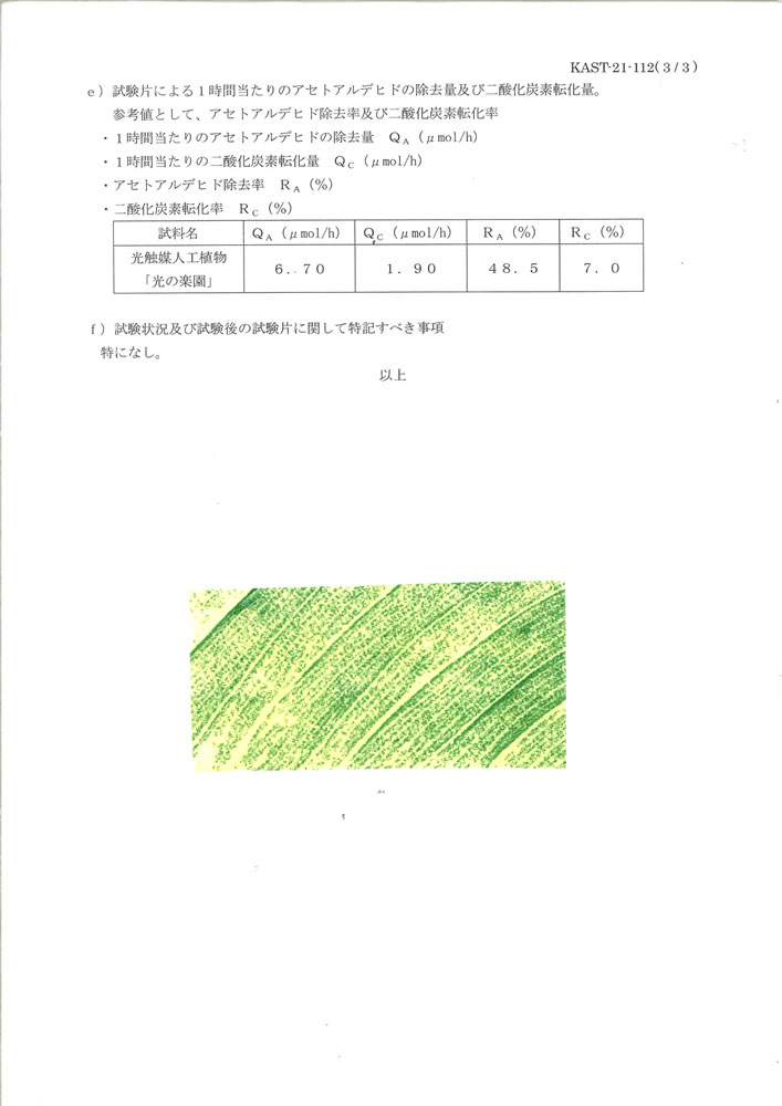酸化チタン 光触媒 V-Catとは? 酸化チタン光触媒についてキレイなだけじゃないんです。 [人に優しい光触媒人工植物の4つのチカラ]酸化チタン触媒は、植物の葉緑素が光のエネルギーを使って二酸化炭素を酸素に変えるように太陽の光や可視光(屋内の目に見える光)のエネルギーを使って、種々の有機物やニオイを分解する作用があります。 「光の楽園」には株式会社豊田中央研究所が開発した可視光応答型光触媒「V-CAT」を使用し、 高い消臭・抗菌・防汚・ホルムアルデヒドの分解力を備えた、より快適な環境を提供できるようになっています。 ![]() ![]() 信頼の証 JIS規格性能試験をクリア! このたび、「光の楽園」は、